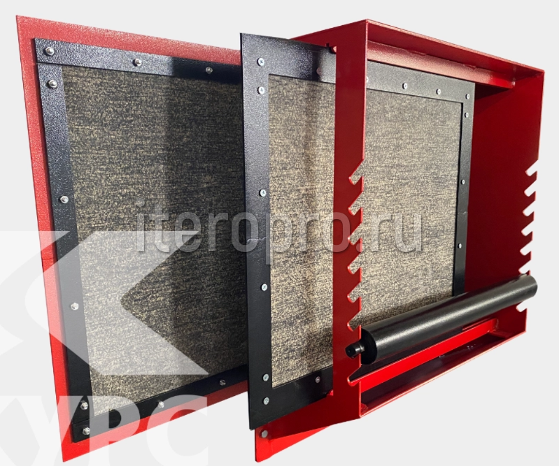 Прямоугольное окно предкамеры изготавливается нескольких размеров в зависимости от габаритов камеры. Проем предкамеры закрывается двумя резиновыми шторками на раме, которые прорезаются по форме обрабатываемой детали. Снаружи предкамеры расположен регулируемый по высоте рольганг, по нему легко перемещать длинномерное изделие во время обработки.